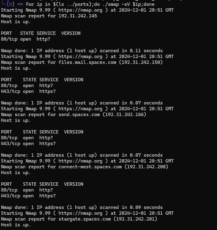 for ip in $(ls ../ports);do ./smap -sV $ip;done