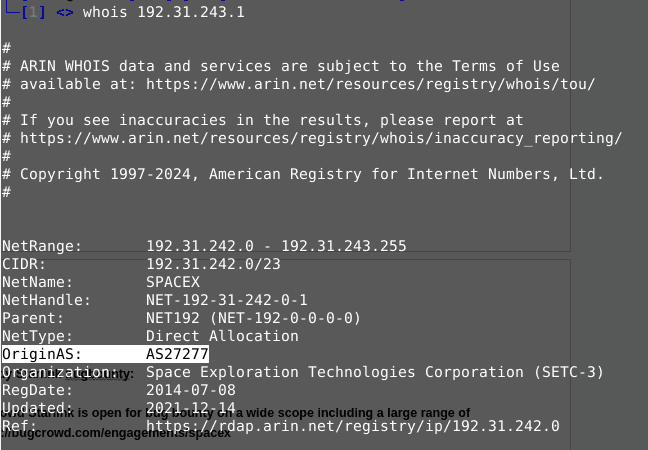 By looking at WHOIS data, we can see that SpaceX has its own AS number: 27277.