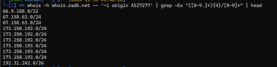 whois -h whois.radb.net -- '-i origin AS27277' | grep -Eo "([0-9.]+){4}/[0-9]+" | head