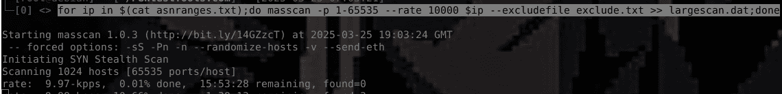for ip in $(cat asnranges.txt);do masscan -p 1-65535 --rate 10000 $ip --excludefile exclude.txt >> largescan.dat;done