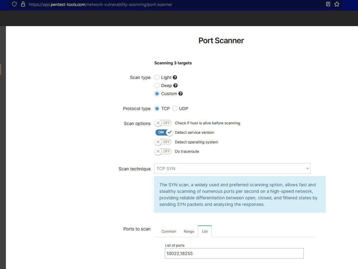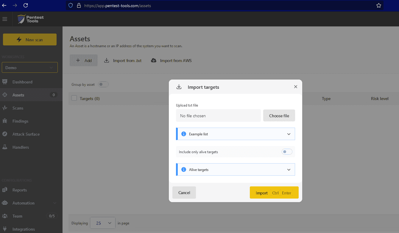 Let's t upload the list of live hosts from BIGF00t.sh in file  “DATA\alive.list” as a target list in Pentest-tools.com: