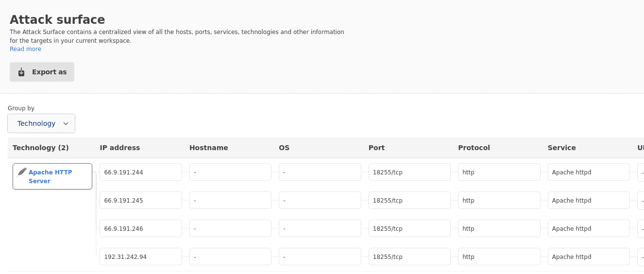 Looking at the mapped Attack Surface, sorted by IPs, reveals that these Apache web servers are running on the non-standard HTTP port 18255.