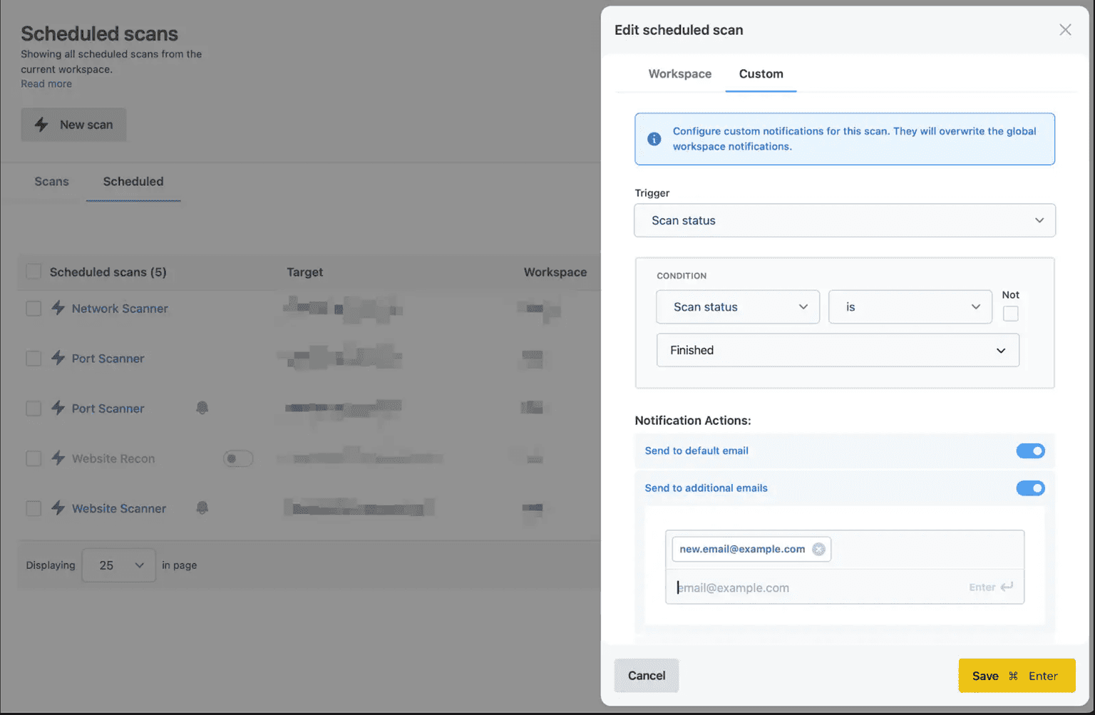 Available for port scanning, vulnerabilities, and subdomains, scan diff highlights new and updated findings compared to your previous scan on the same target within a set workspace.
