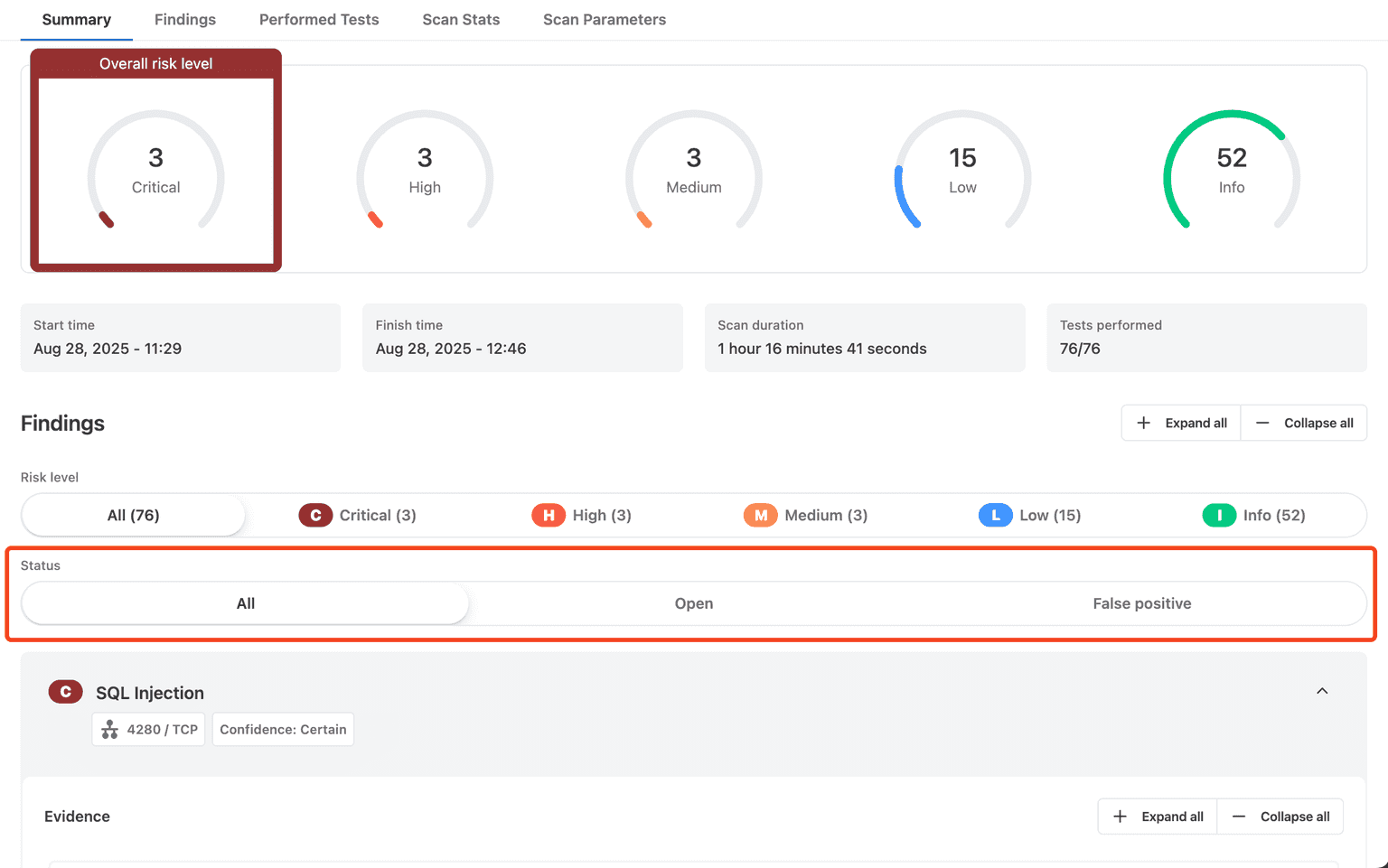 We’ve improved the Findings experience: grouping now takes the port into account. If the same issue is detected on the same target but on different ports, you’ll see separate entries, so nothing gets merged away by accident.