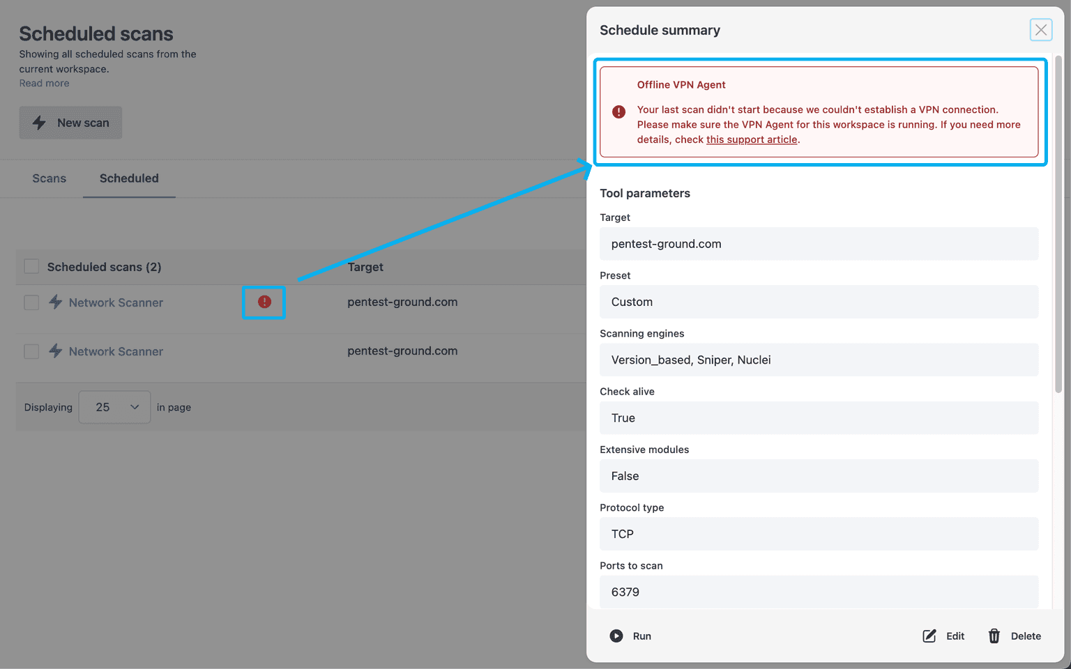 Run your scans as usual → open Findings → filter or group duplicates if you want a compact view → edit, verify, or export each port-specific finding separately → re-scan after fixes to confirm every exposed port is clean.